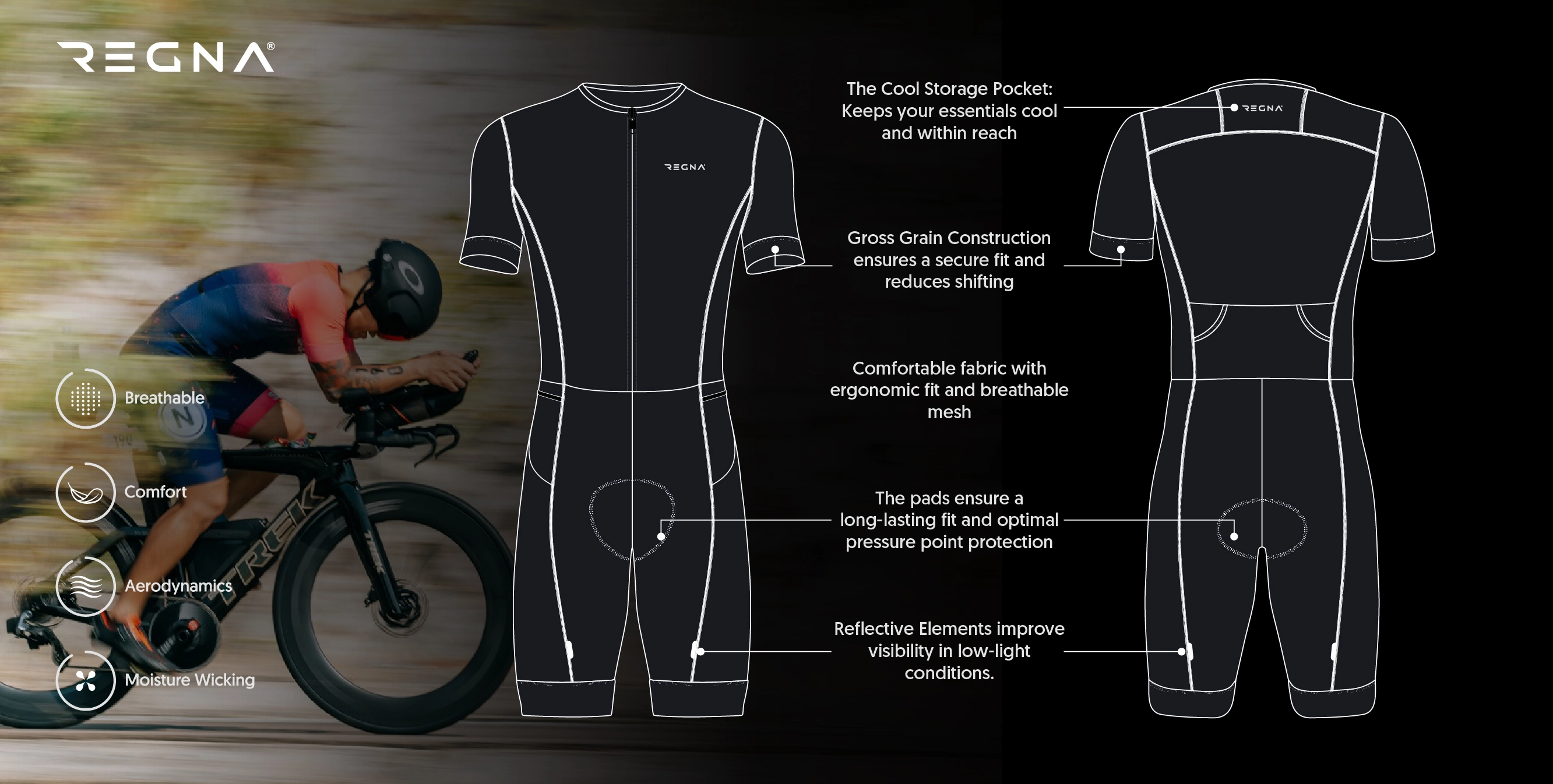 The Performance Framework: The main body and legs are constructed from premium Italian Marettimo fabric. It provides consistent, supportive stretch to combat muscle fatigue, while its technical structure ensures durability and shape retention, race after race.